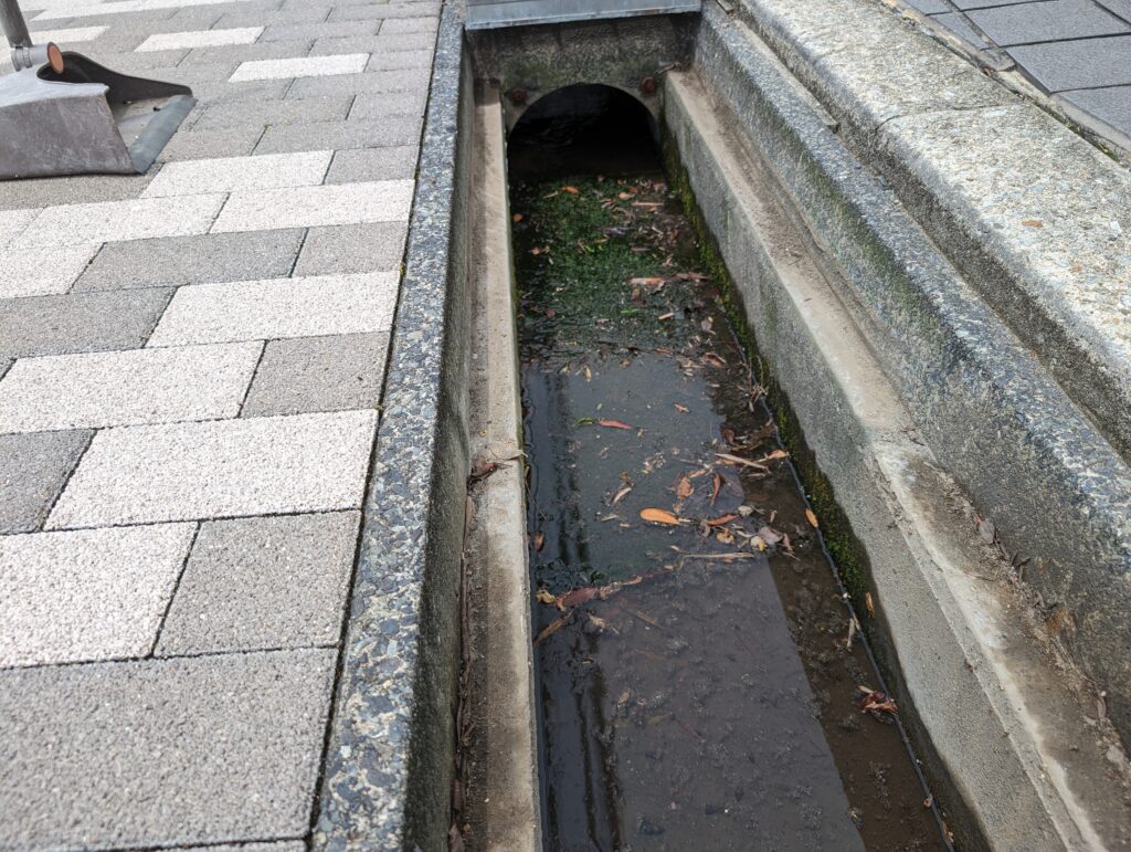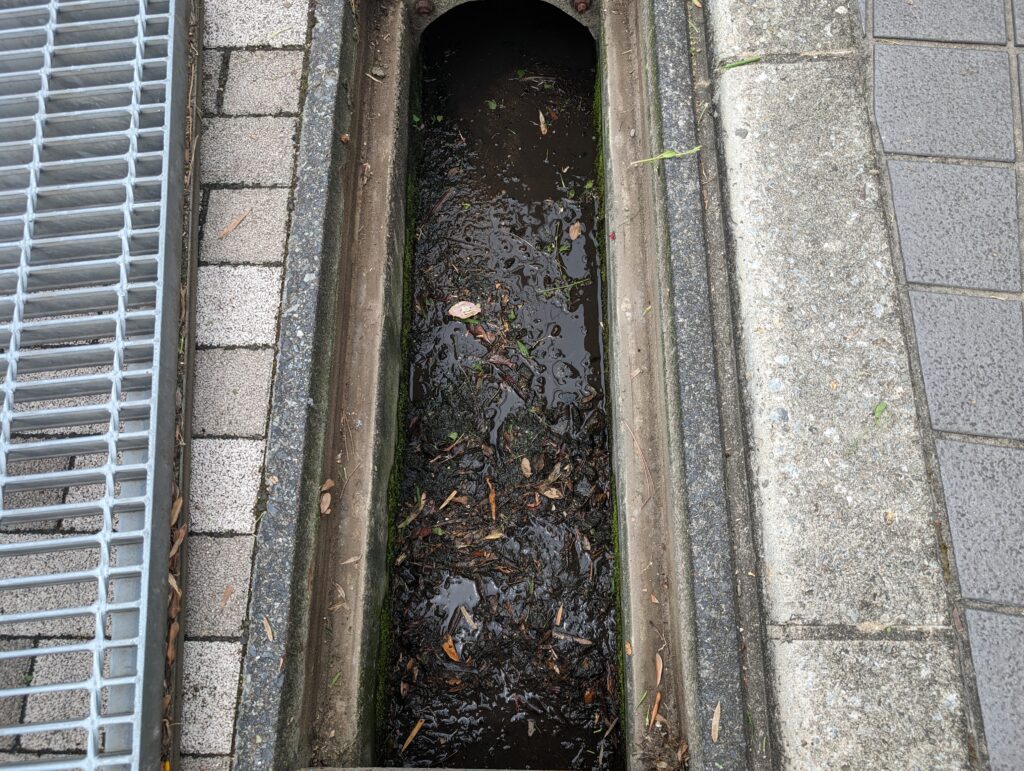 家前の水路の掃除作業、側溝の溝蓋を